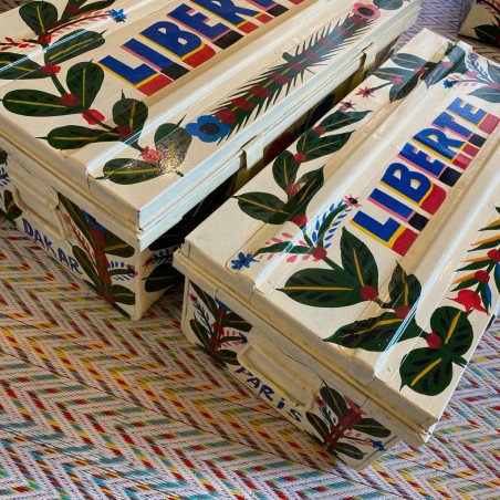 Painted trunks in Senegal with flowers and messages (Amour, Belle vie, Bonheur...).Large size: 65x35x25 cm