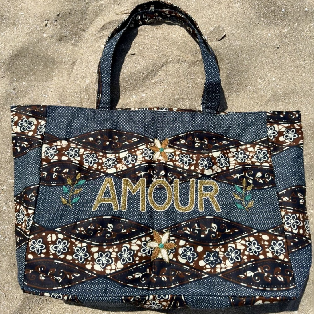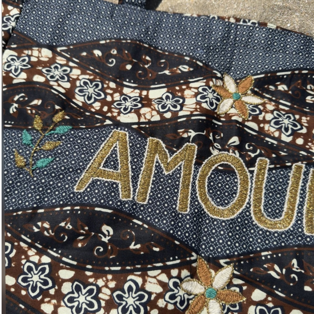 Sac Cabas grand modèle brodé à la main à Dakar, entièrement doublé avec une grande poche intérieure. Se porte aussi bien à la ville, à la plage ou pour le voyage. Broderie double face.