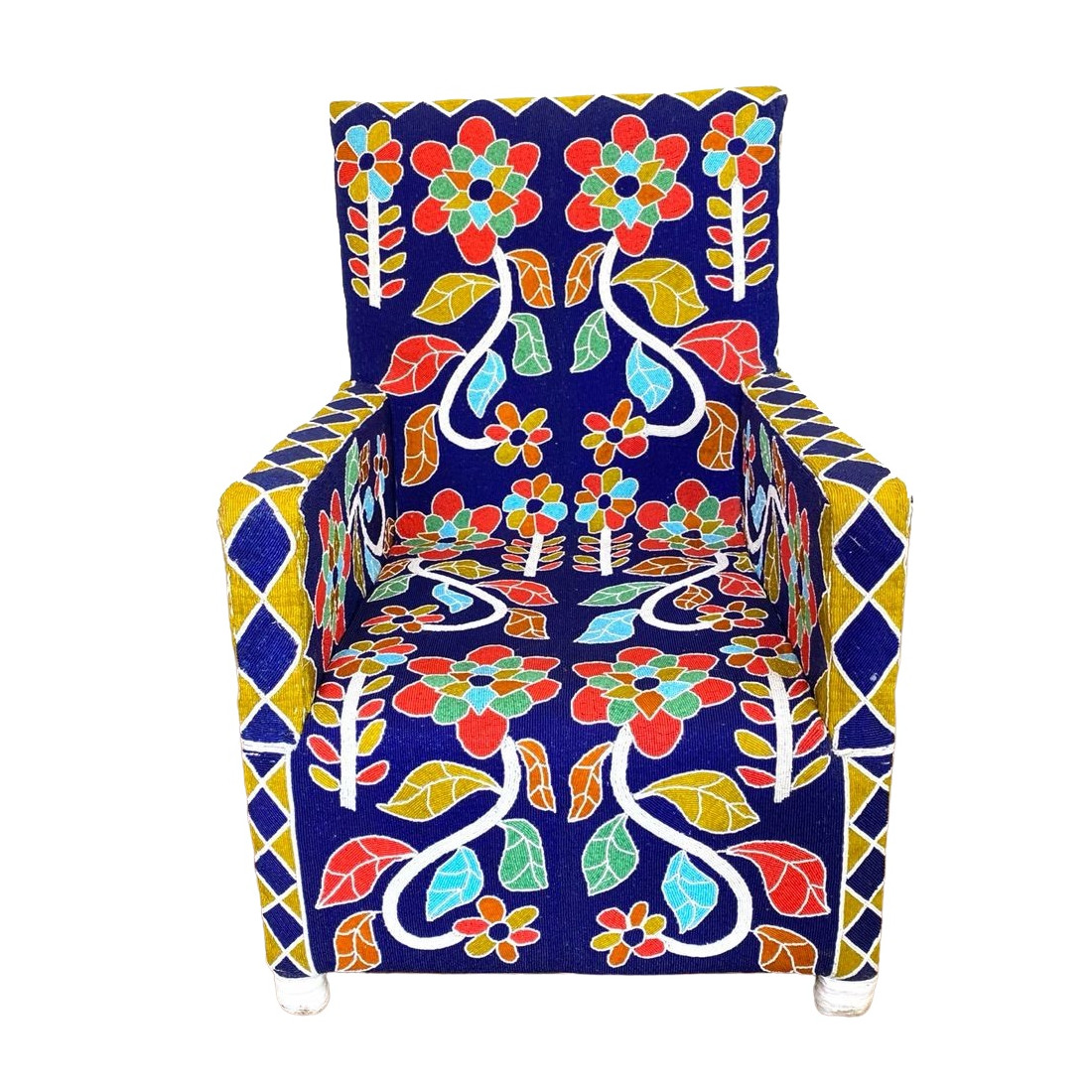 Les perles sont assemblées à la main puis cousues et collées sur des bandes de tissu qui recouvrent le fauteuil.