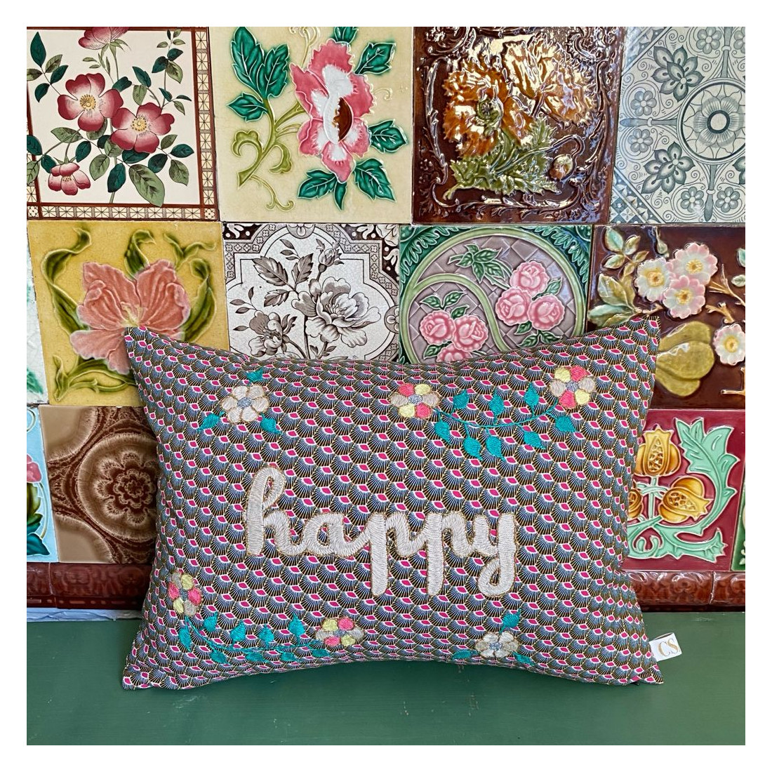 Coussin brodé HAPPY